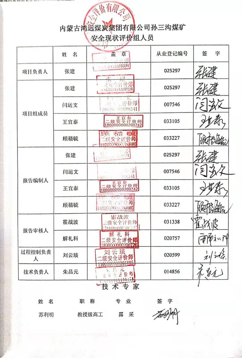 | 參與安全評價工作的安全評價師: 張建 閆運文 王宜泰 顧嵇毓 |