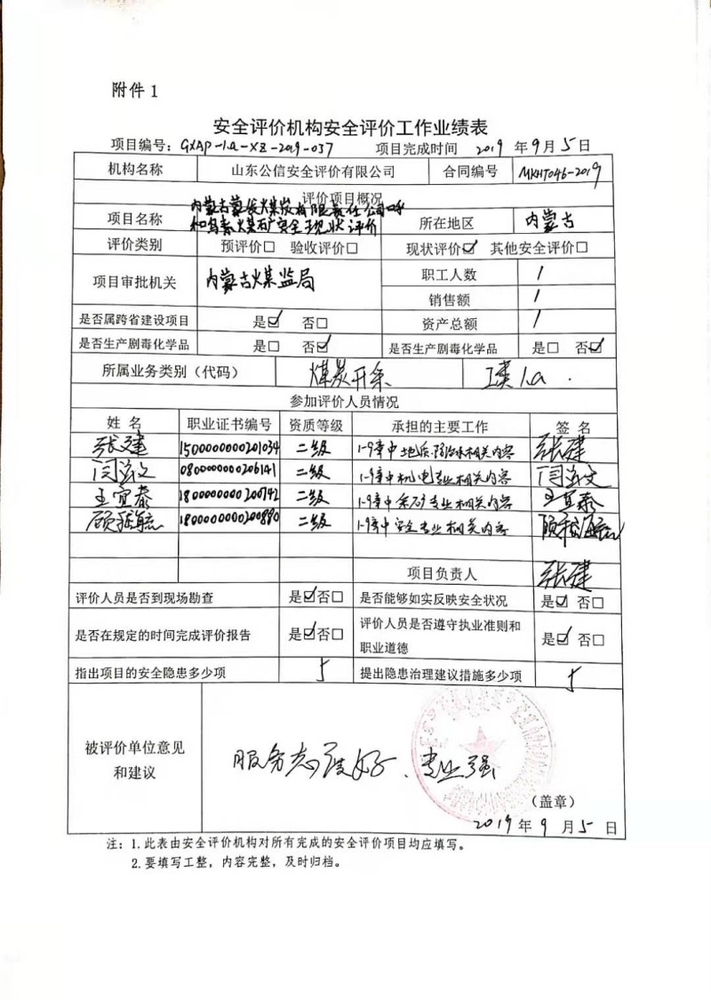 | 現(xiàn)場(chǎng)開展安全評(píng)價(jià)工作的人員、時(shí)間及主要任務(wù): 張建 閆云文 王宜泰 顧嵇毓 于2019年6月24日到現(xiàn)場(chǎng)進(jìn)行調(diào)查、搜集資料,進(jìn)行現(xiàn)場(chǎng)評(píng)價(jià)。 于2019年8月15日到現(xiàn)場(chǎng)評(píng)價(jià)時(shí)存在的問題進(jìn)行了復(fù)查。 |