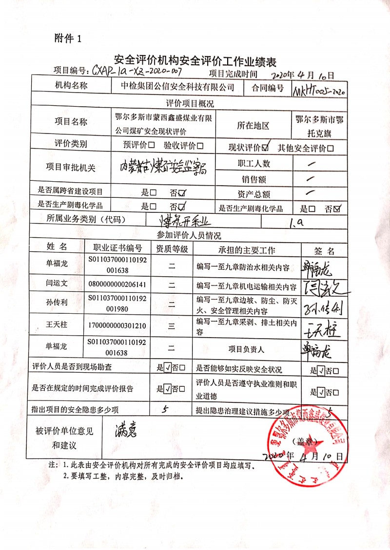 | 到現(xiàn)場開展安全評價工作的人員、時間及主要任務(wù): 人員:單福龍、閆運文、孫傳利、王天柱 時間、任務(wù): 2020年3月20日現(xiàn)場調(diào)查;2020年3月21日復(fù)查;2020年3月22日至2020年4月9日編寫修改完善報告。 |